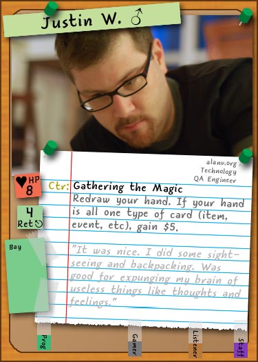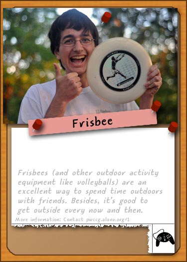 ![]() A sample Character card, pre-revamp, "Justin W." ![]() A sample Character card from the Base Set, "Owen J." ![]() A sample Character card from the Boost Set, "Ben & Simiao" ![]() A sample Event card from the Celebrations Set, "Replacement" ![]() A sample Item card from the Activities set, "Frisbee" ![]() A sample Storage card from the Destinations set, "Pittsburgh" ![]() A sample Task card from the Starter Cards, "Design and Build" |