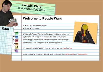 Student Wars Version 2 had become too specific for my post-college life; after all, who cares about GPA anymore? The cards were also still too full of text, even following the revamp. The result was a new game, People Wars, that had players attempting to score the most points (representing either cash or GPA, as appropriate) while killing their competition. The game has been developed off and on, with large periods of inactivity.