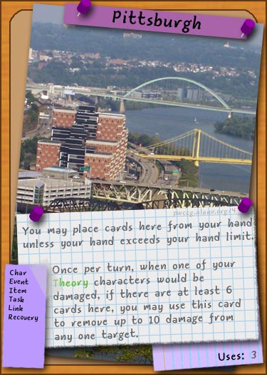 The card designs are reminiscent of my old website skin, with various components pinned to a corkboard. The designs are also meant to emphasize colors and positioning over text, so there is less dependency on reading the cards. The revamp necessitated moving the traits to the side of the card, vertically, rather than placing them horizontally at the bottom of the card. The card colors continue in the tradition of PPA TCG with green characters, yellow events, red items, blue "victory", and purple "other" cards.