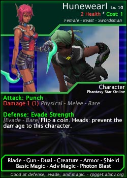 The game has never been played; indeed, the game has the dubious honor of being my card game with the most cards created before being played (PSO TCG Version 2 was also released before playtesting took place). The original intent was for the cards to get tweaked as playtesting was done. However, that didn't really work out.