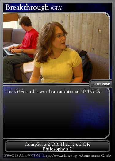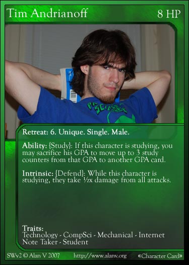 This game is the fourth in the PPA TCG series of games, and is unusual in that it was released (with three separate expansions), then un-released for a revamp, then abandoned in favor of People Wars. Work on the game started soon after the original Student Wars was retired and proceeded rapidly, resulting in a website with downloadable cards soon after. However, feedback from Ian and Tim resulted in much revision, finally leading me to slightly rework the card templates and un-release the main portion of the game. Unfortunately, by that point, I had graduated college and started work, and the idea of a game based around building up GPA didn't seem appropriate anymore. As such, the game was put on hiatus (and later abandoned) in favor of People Wars.