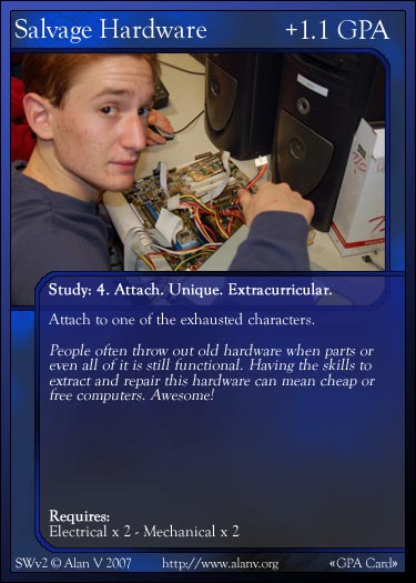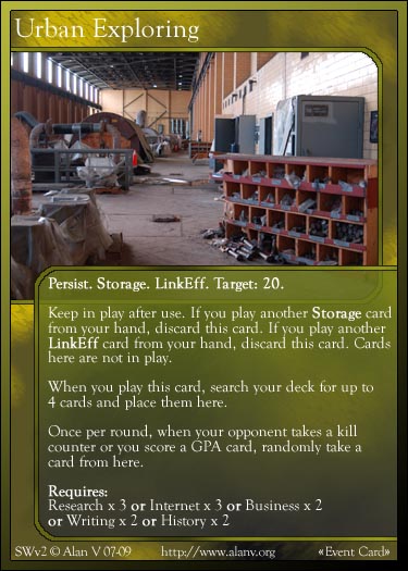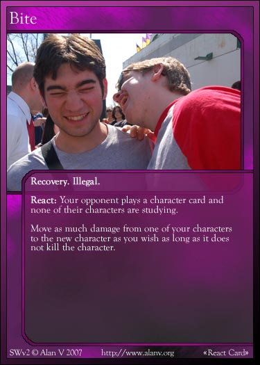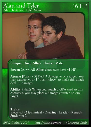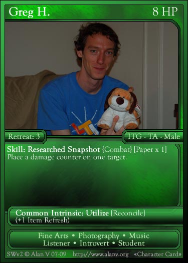 |  A sample Character card, pre-revamp, "Tim Andrianoff", from the base set  A sample Character card, post-revamp, "Greg H.", from the base set  A sample dual Character card, pre-revamp, "Alan and Tyler", from the Alliances expansion  A sample Common Actions Summary card for Fine Arts, post-revamp, from the base set  A sample GPA card, pre-revamp, "Salvage Hardware", from the Alliances expansion  A sample Evant card, pre-revamp, "Urban Exploring", from the Experiences expansion  A sample Item card, post-revamp, "Plant", from the base set  A sample React card, pre-revamp, "Bite", from the Alliances expansion  A sample Attachment card, post-revamp, "Breakthrough", from the base set |